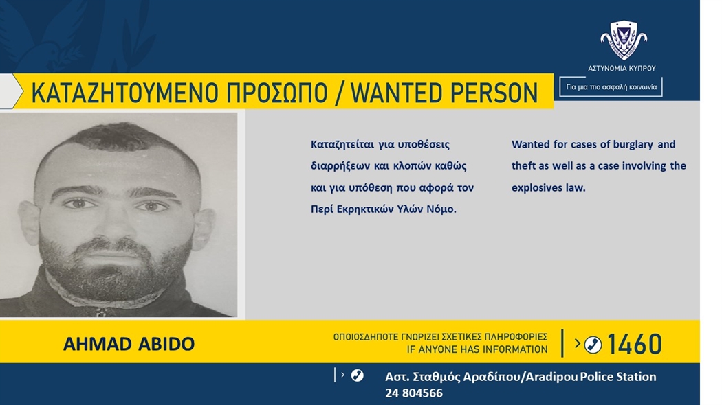 Η Αστυνομία ζητεί πληροφορίες για εντοπισμό του AHMAD ABIDO, 31 ετών από την Συρία, η φωτογραφία του οποίου δημοσιεύεται, σχετικά με διερευνώμενη υπόθεση διάρρηξης κατοικίας και...