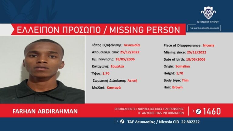 Η Αστυνομία ζητά πληροφορίες που μπορούν να βοηθήσουν στον εντοπισμό του FARHAN ABDIRAHMAN, 16 ετών από τη Σομαλία ο οποίος απουσιάζει από το χώρο διαμονής του στην...