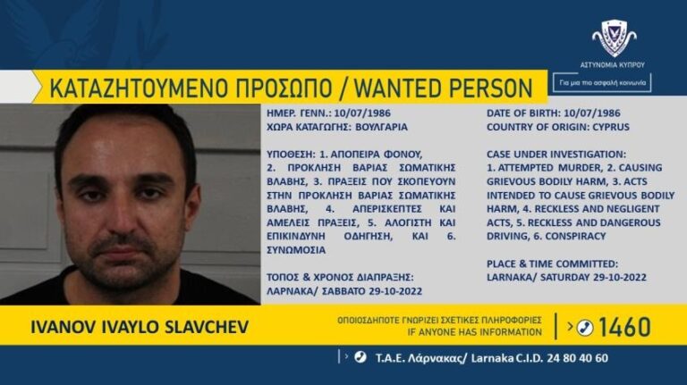 Υπόθεση απόπειρας φόνου που διαπράχθηκε χθες βράδυ, στη Λάρνακα, διερευνά η Αστυνομία, που δίνει στη δημοσιότητα τα στοιχεία και φωτογραφίες δύο υπόπτων καταζητούμενων προσώπων, άντρες...
