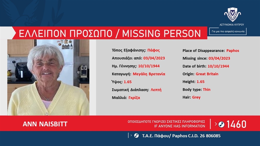 Η Αστυνομία ζητά πληροφορίες που μπορούν να βοηθήσουν στον εντοπισμό της Ann Naisbitt, 79 ετών η οποία απουσιάζει από η ώρα 10 το πρωί σήμερα...