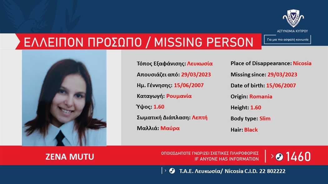 Η Αστυνομία ζητά πληροφορίες που μπορούν να βοηθήσουν στον εντοπισμό της ZENA MUTU, 16 ετών, από τη Ρουμανία, η οποία απουσιάζει από το χώρο διαμονής...