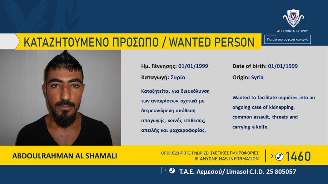 Η Αστυνομία ζητά πληροφορίες που μπορούν να βοηθήσουν στον εντοπισμό του ABDOULRAHMAN AL SHAMALI, 24 ετών, από τη Συρία, εναντίον του οποίου εκκρεμεί δικαστικό ένταλμα...