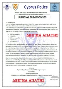Ιδιαίτερη προσοχή συστήνει η Αστυνομία στο κοινό, σχετικά με μηνύματα ηλεκτρονικού ταχυδρομείου (e-mail), που ψευδώς παρουσιάζουν την Αστυνομία Κύπρου, ως αποστολέα. Ως αποστολείς παρουσιάζονται ψευδώς...