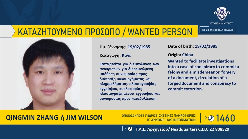 Η Αστυνομία ζητά πληροφορίες που μπορούν να βοηθήσουν στον εντοπισμό του QINGGMIN ZHANG ή JIM WILSON, 37 ετών, από την Κίνα, εναντίον του οποίου εκκρεμεί...