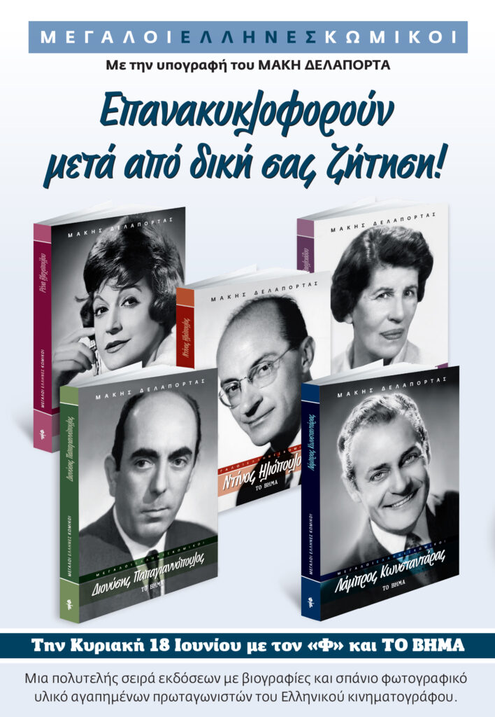 Μη χάσετε αυτή την Κυριακή στην έκδοση συσκευασίας μαζί με τον Φιλελεύθερο και ΤΟ ΒΗΜΑ, τις βιογραφίες μεγάλων Ελλήνων κωμικών του κλασικού κινηματογράφου, με την υπογραφή του Μάκη Δελαπόρτα, που επανακυκλοφορούν για να σας συντροφεύουν το καλοκαίρι.