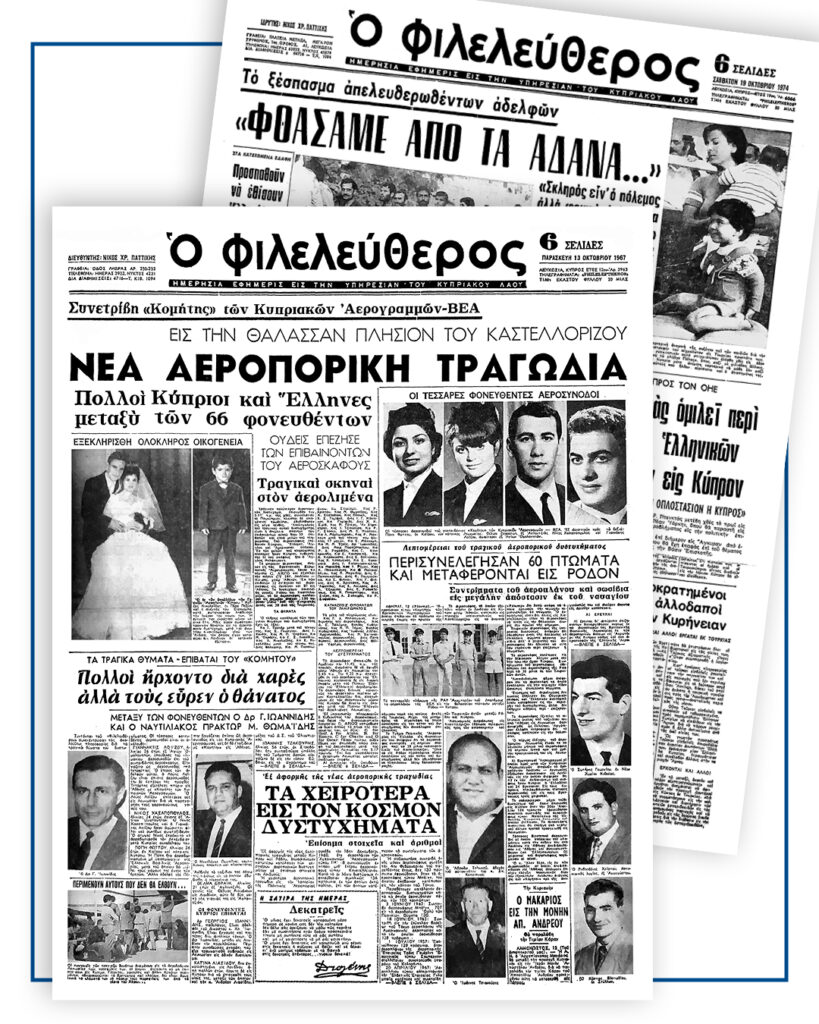 Ο Φιλελεύθερος – έκπληξη ξανά σήμερα, όπως υποσχεθήκαμε. Με μια έκδοση ίδιας ημερομηνίας 58 χρόνια πριν, να συνοδεύει τη σημερινή. 13 Οκτωβρίου 1967. Μια έκδοση με όλες τις πληροφορίες για την αεροπορική τραγωδία, που συγκλόνισε Κύπρο και Ελλάδα. Το αεροσκάφος «κομήτης» των Κυπριακών Αερογραμμών κατέπεσε «εις την θάλασσαν πλησίον του Καστελλόριζου» – «Πολλοί Κύπριοι και Έλληνες μεταξύ των 66 φονευθέντων»…