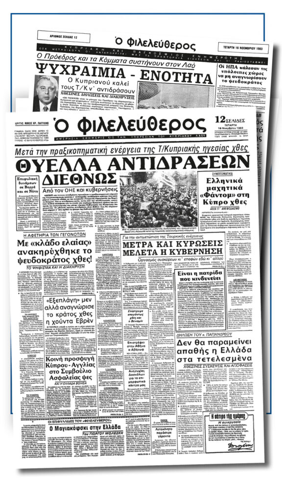 Το χρονικό ανακήρυξης του ψευδοκράτους, καθώς και τις αντιδράσεις της κυπριακής κυβέρνησης, καλύπτει στις ειδησεογραφικές του σελίδες ο Φιλελεύθερος στις 16 Νοεμβρίου 1983. Είναι η νέα έκδοση της εποχής που τυπώνει σήμερα η εφημερίδα μας και διανέμεται μαζί με την έκδοση της ημέρας, στο πλαίσιο των 70χρονων.