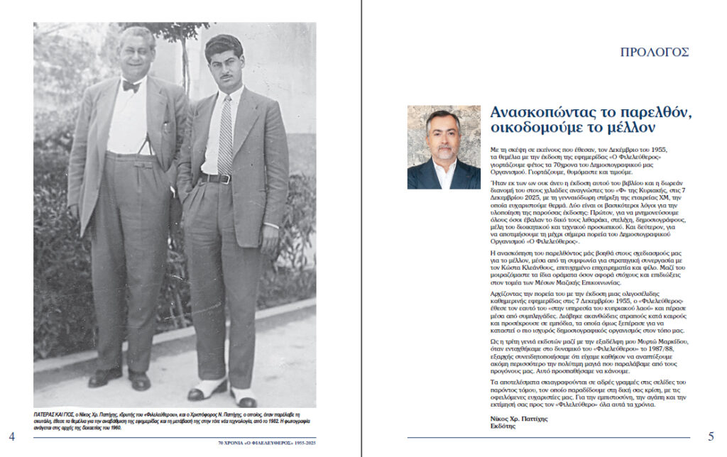 «Ήταν εκ των ων ουκ άνευ η έκδοση αυτού του βιβλίου και η δωρεάν διανομή του στους χιλιάδες αναγνώστες του ‘Φ’ της Κυριακής, στις 7 Δεκεμβρίου 2025, με τη γενναιόδωρη στήριξη της εταιρείας ΧΜ, την οποία ευχαριστούμε θερμά. Δύο είναι οι βασικότεροι λόγοι για την υλοποίηση της παρούσας έκδοσης: Πρώτον, για να μνημονεύσουμε όλους όσοι έβαλαν το δικό τους λιθαράκι, στελέχη, δημοσιογράφους, μέλη του διοικητικού και τεχνικού προσωπικού. Και δεύτερον, για να αποτιμήσουμε τη μέχρι σήμερα πορεία του Δημοσιογραφικού Οργανισμού ‘Ο Φιλελεύθερος’».