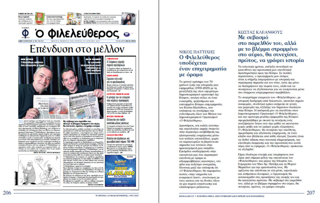 Ο «Φ», γιορτάζοντας τα 70χρονά του, ανοίγει νέο κεφάλαιο στην ιστορία του με εφαλτήριο τη στρατηγική συνεργασία με τον επιτυχημένο Κύπριο επιχειρηματία Κώστα Κλεάνθους, ο οποίος συμμερίστηκε κοινά οράματα με τον Νίκο Χρ. Παττίχη για το μέλλον του Δημοσιογραφικού Οργανισμού, αλλά και για την αποστολή των ΜΜΕ γενικότερα. Έχουν ήδη καταρτιστεί συγκεκριμένοι σχεδιασμοί, που σταδιακά υλοποιούνται.