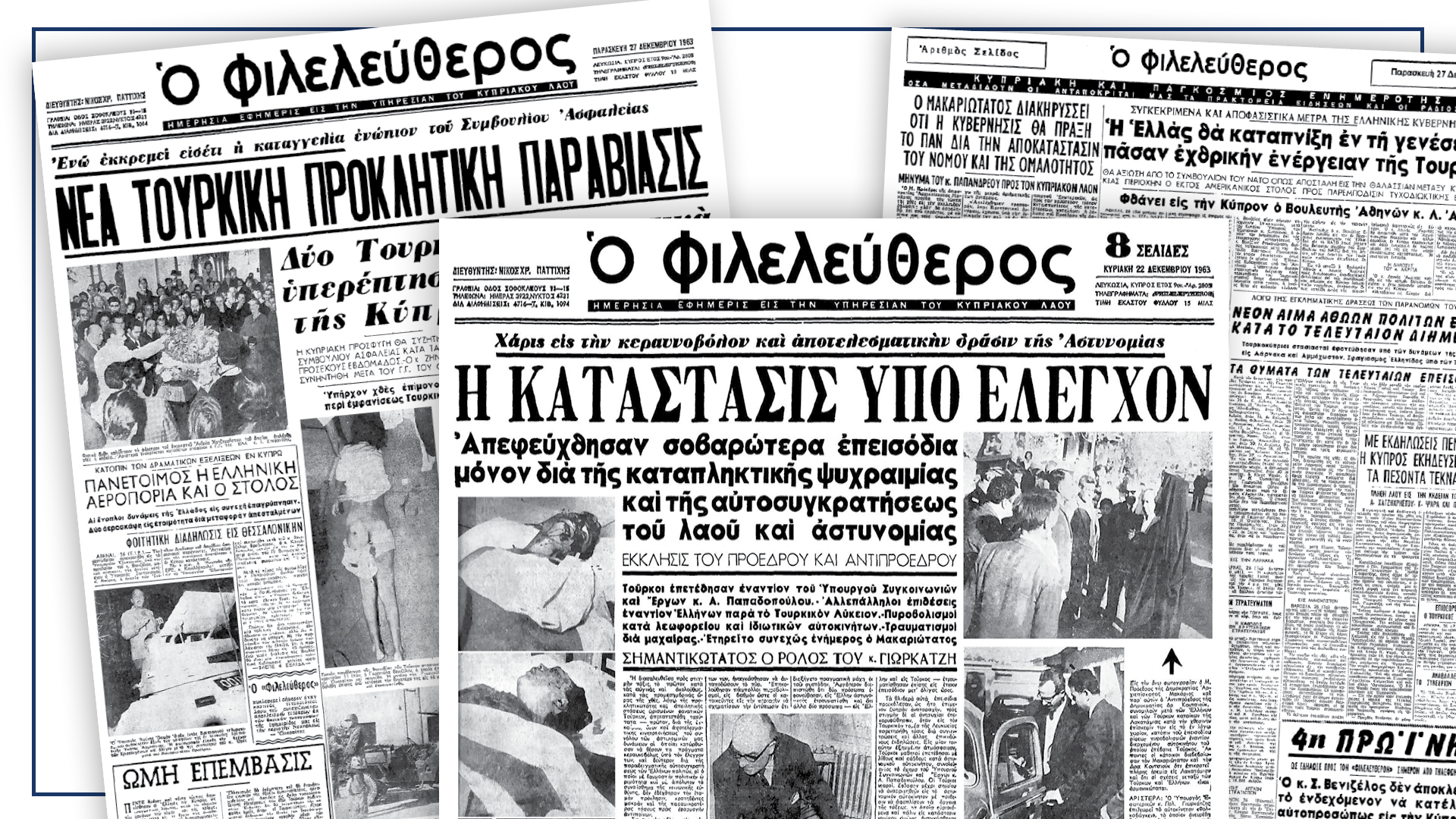 Με τον τίτλο «Η κατάστασις υπό έλεγχον» κυκλοφόρησε ο Φιλελεύθερος στις 22 Δεκεμβρίου 1963, με ρεπορτάζ για όσα συνέβησαν την προηγούμενη μέρα και ήταν η έναρξη αυτού που στη συνέχεια ονομάστηκε «Ματωμένα Χριστούγεννα» και κατέληξε στην αποχώρηση των Τουρκοκυπρίων από το κυπριακό κράτος. Η έκδοση της ημέρας, στο πλαίσιο των επετειακών μας εκδόσεων και μαζί οι ειδησεογραφικές σελίδες της 27 Δεκεμβρίου1963 όπου περιγράφεται η συνέχεια των διακοινοτικών ταραχών και η προσφυγή της Δημοκρατίας στο Συμβούλιο Ασφαλείας του ΟΗΕ.