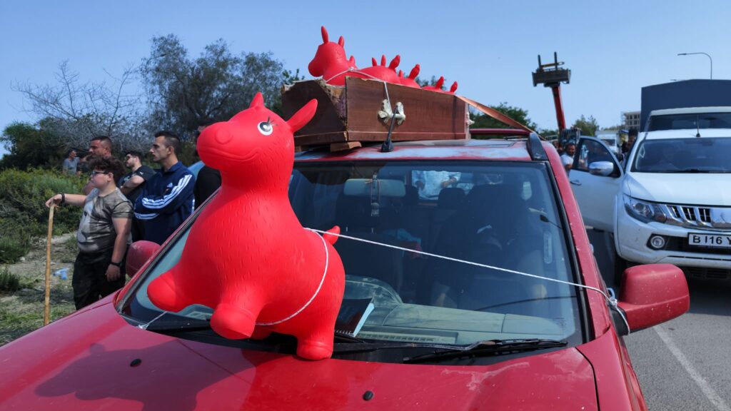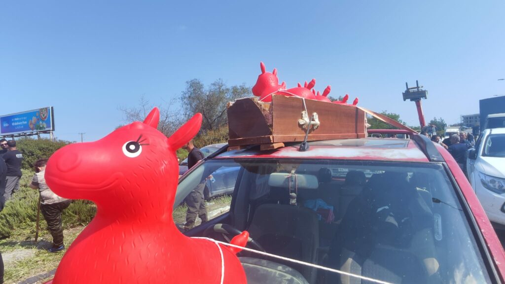 Πέρα από το αυτοκίνητο με φέρετρο, το οποίο χρησιμοποιούσαν κάθε φορά στις κινητοποιήσεις τους για τον αφθώδη πυρετό, πλέον τοποθετούν και πλαστικά ζώα.