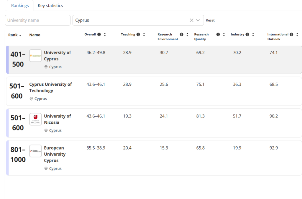 Ανάμεσα στα κορυφαία πανεπιστήμια του κόσμου κατατάσσονται τα Δημόσια και Ιδιωτικά Πανεπιστήμια στην Κύπρο. Συγκεκριμένα, η διεθνής λίστα Times Higher Education (THE) World University Rankings 2026, συμπεριλαμβάνει το Πανεπιστήμιο Κύπρου (University of Cyprus), το Τεχνολογικό Πανεπιστήμιο Κύπρου (ΤΕΠΑΚ – Cyprus University of Technology), το Πανεπιστήμιο Λευκωσίας (University of Nicosia), και το Ευρωπαϊκό Πανεπιστήμιο Κύπρου (European University Cyprus).