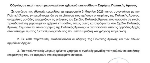 Αποστολέας είναι το Γραφείο Ασφάλειας και Υγείας του υπουργείου Παιδείας και στόχος είναι η ενημέρωση των σχολείων για το πώς θα δράσουν σε περίπτωση που ηχήσουν οι σειρήνες λόγω της έκρυθμης κατάστασης που επικρατεί τις τελευταίες μέρες.