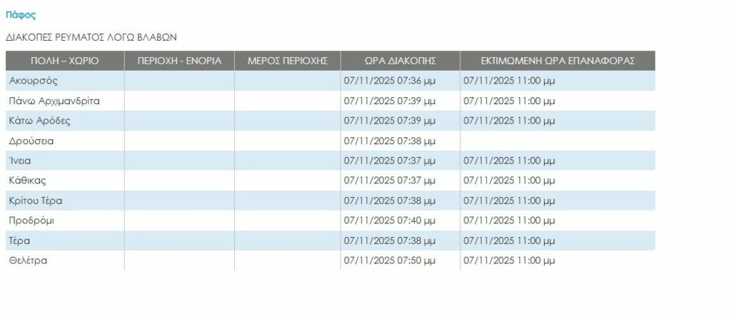 Συγκεκριμένα, η διακοπή ηλεκτροδότησης λόγω των καταρρακτωδών βροχών προκλήθηκε στις Κοινότητες Κάτω Αρόδες, Κάθικα, Πάνω Αρχιμανδρίτα, Ακουρσός, Δρούσεια, Ίνεια, Κρίτου Τέρα, Προδρόμι, Τέρα και Θελέτρα.