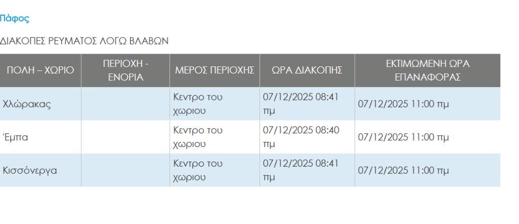Συγκεκριμένα, χωρίς ρεύμα έχουν μείνει τρεις κοινότητες από τις 8:40, ενώ η εκτιμώμενη ώρα επαναφοράς της ηλεκτροδότησης είναι τις 11:00.