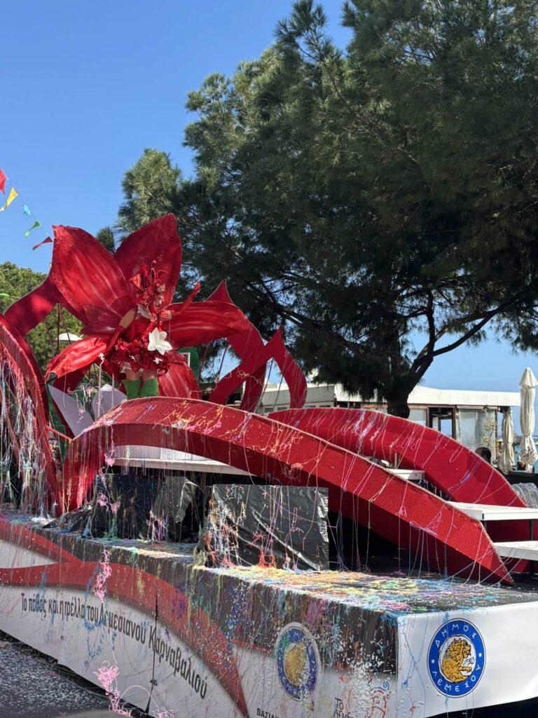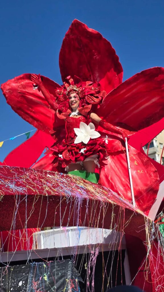 Ακολούθησε η Βασίλισσα του Πάθους και της Τρέλας του Λεμεσιανού Καρναβαλιού με το εντυπωσιακό της άρμα και τους ξυλοπόδαρους.