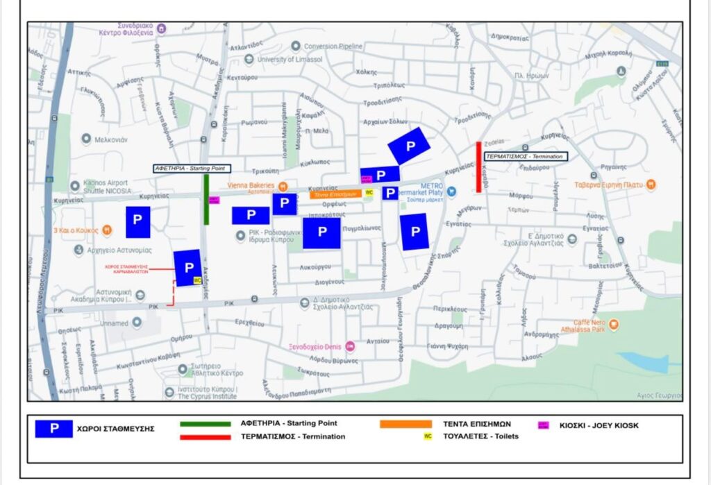 Το σημείο εκκίνησης της παρέλασης θα είναι στη συμβολή της Λεωφόρου Κερύνειας με Γλαύκου Κληρίδη και ο τερματισμός στη συμβολή της οδού Καραβά με τη Λεωφόρο Κερύνειας.