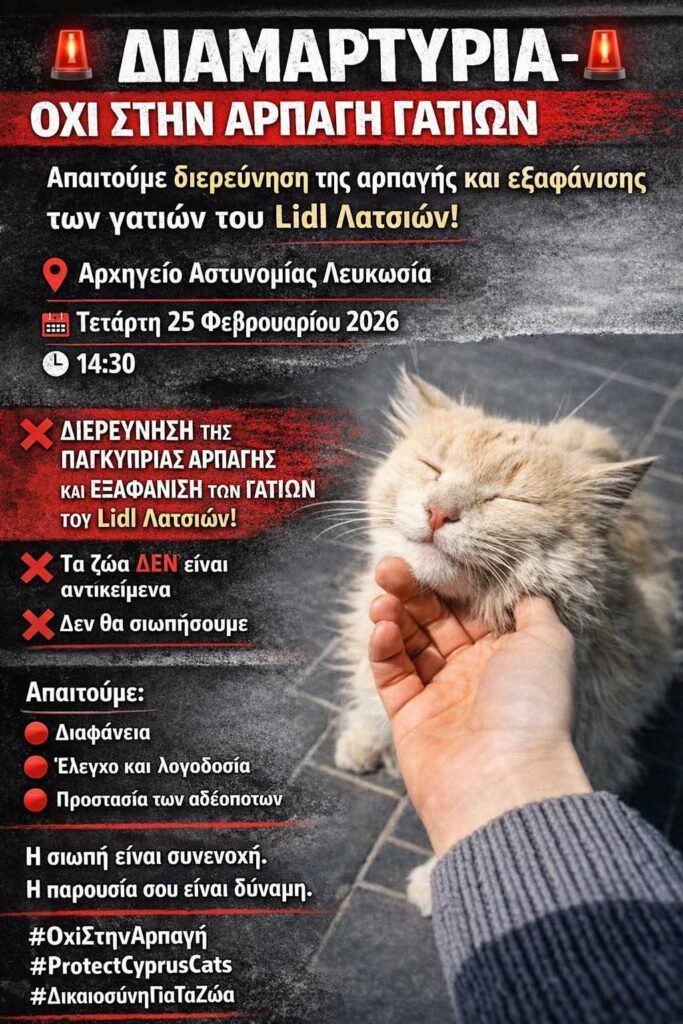 Εκδήλωση διαμαρτυρίας για τις εξαφανίσεις γατών πραγματοποιείται σήμερα στις 14:30, έξω από το Αρχηγείο Αστυνομίας, με αίτημα όπως οι αρμόδιοι διερευνήσουν πλήρως τις υποθέσεις.