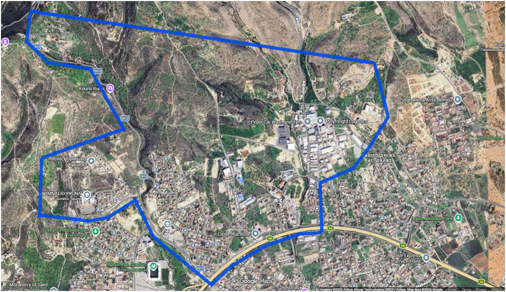 Η περιοχή που εκτείνεται βόρεια του αυτοκινητόδρομου Λεμεσού – Πάφου και συγκεκριμένα οι οδοί που περικλείονται από: