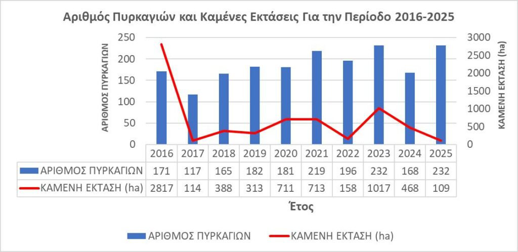 Στην μελέτη τα παιδιά του Νικολαιδείου τονίζουν ότι είναι πλέον τρομακτικές οι διαστάσεις που προσλαμβάνει στον τόπο μας το φαινόμενο των δασικών πυρκαγιών. Από στατιστικά δεδομένα του Τμήματος Δασών, για τη δεκαετία 2016- 2025 ο μέσος όρος πυρκαγιών ανά έτος ανέρχεται στις 186, επισημαίνεται, και ιδιαίτερα για την περίοδο Απριλίου – Οκτωβρίου, λόγω υψηλών θερμοκρασιών, ο κίνδυνος έκρηξης και επέκτασης των πυρκαγιών είναι αυξημένος, με μέσο όρο 163 πυρκαγιές.