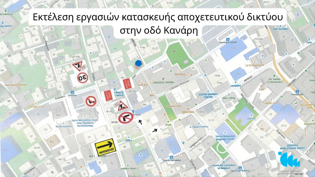 Ο Επαρχιακός Οργανισμός Αυτοδιοίκησης Λεμεσού με την συγκατάθεση της Αστυνομίας Κύπρου και του Δήμου Λεμεσού, ανακοίνωσε ότι την Κυριακή 26/04/2026 από τις 7:00 μέχρι τις 16:00 θα διεξάγει εργασίες κατασκευής αποχετευτικού δικτύου λυμάτων στην οδό Κανάρη στην Λεμεσό.