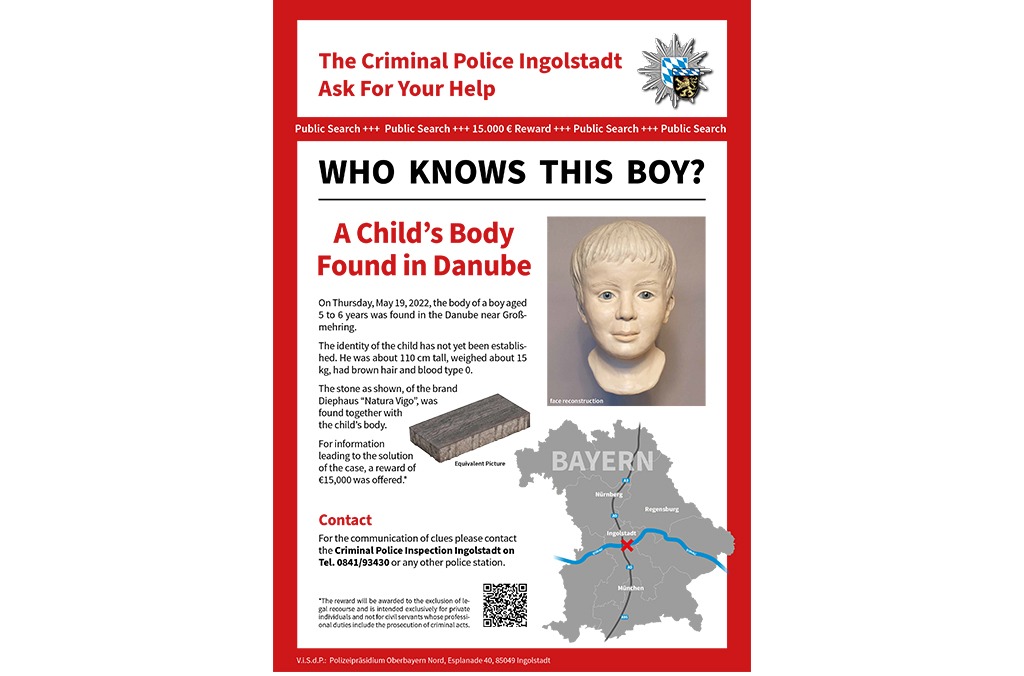 Η Ιντερπόλ δήλωσε ότι δεν είναι γνωστό πόσο καιρό το πτώμα βρισκόταν στο νερό όταν βρέθηκε στις 19 Μαΐου 2022, κοντά στο Grossmehring, έναν βαυαρικό δήμο 7.500 κατοίκων. Το άτυχο παιδί είχε ύψος περίπου 110 εκατοστά, ζύγιζε 15 κιλά, είχε καστανά μαλλιά και ομάδα αίματος 0.