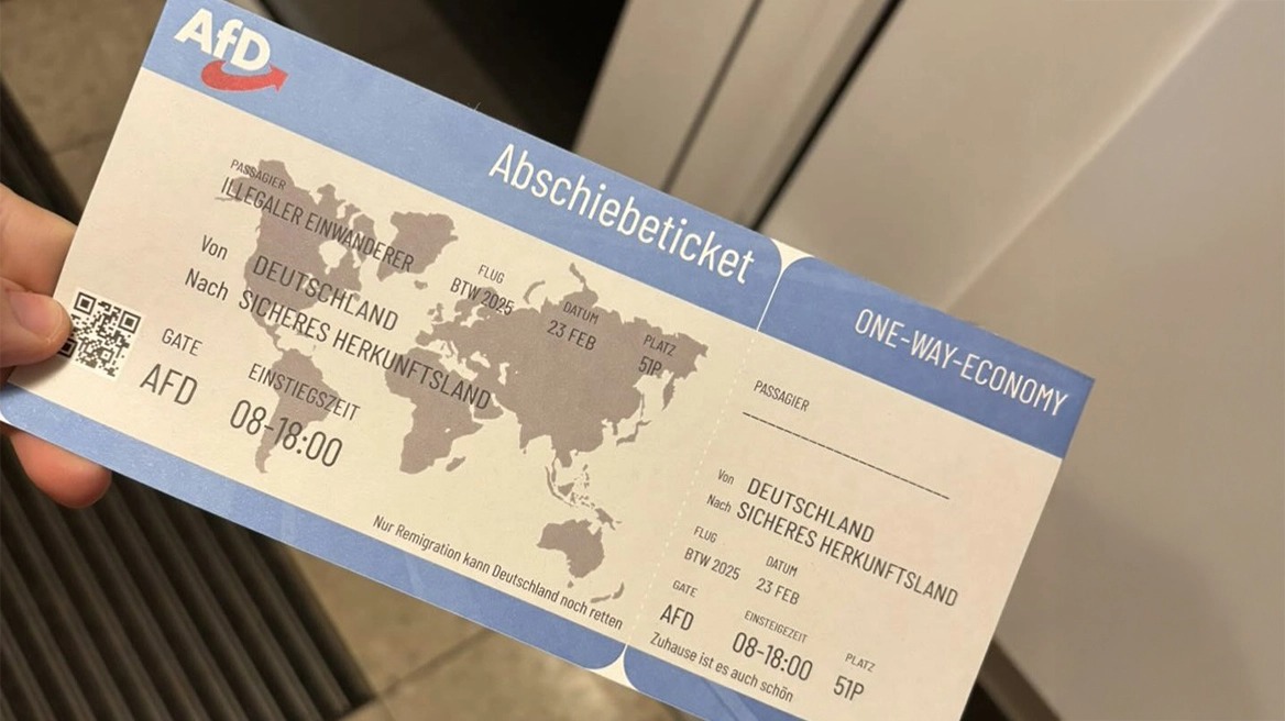 Πρόκειται για προεκλογικά φυλλάδια με τη μορφή εισιτηρίου και αναφορές περί παράτυπων μεταναστών που σκοπεύουν να ταξιδέψουν από τη Γερμανία προς «ασφαλείς χώρες προέλευσης». Έπειτα με μικρά γράμματα αναγράφεται στο επίμαχο φυλλάδιο «μόνο ο επαναπατρισμός μπορεί να σώσει τη Γερμανία. Είναι ωραία πίσω στην πατρίδα».