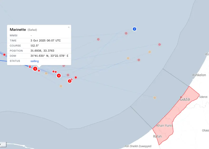 Το σκάφος με το όνομα Marinette βρισκόταν περίπου 150 χιλιόμετρα από τις ακτές της Γάζας στις 03:50 ώρα Κύπρου, όπως έδειχνε το στίγμα γεωεντοπισμού που ανάρτησαν οι διοργανωτές, ενώ τις πρωινές ώρες βρισκόταν ακόμη πιο κοντά στον παλαιστινιακό θύλακα. «Το Marinette συνεχίζει να πλέει», ανέφεραν χθες το βράδυ οι διοργανωτές στα μέσα κοινωνικής δικτύωσης, τονίζοντας ότι αναμένουν την αναχαίτισή του. «Γνωρίζουμε τι μας περιμένει», συμπλήρωσαν.