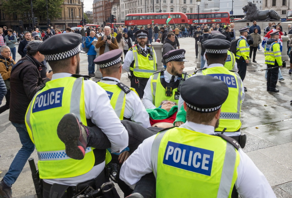 Παρά τις προειδοποιήσεις, εκατοντάδες διαδηλωτές συγκεντρώθηκαν στην πλατεία Τραφάλγκαρ, κρατώντας πανό και φωνάζοντας συνθήματα υπέρ της οργάνωσης. Οι συλλήψεις ξεκίνησαν όταν διαδηλωτές άρχισαν να γράφουν συνθήματα σε δημόσιους χώρους. Όπως μεταδίδουν βρετανικά μέσα, οι παρευρισκόμενοι επευφημούσαν τους συλληφθέντες, φωνάζοντας «Ντροπή σας» προς τους αστυνομικούς.