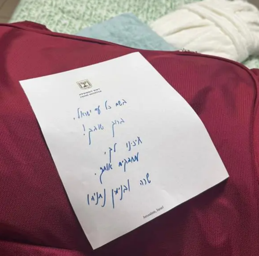 «Εκ μέρους όλου του λαού του Ισραήλ, καλώς ήρθατε πίσω!», γράφει στο σημείωμα.