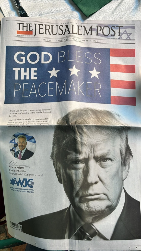 Το κλίμα υποστήριξης προς τον Τραμπ αποτυπώθηκε και στο πρωτοσέλιδο της Jerusalem Post, το οποίο ανέφερε χαρακτηριστικά: «God bless the peacemaker» («Ο Θεός να έχει καλά τον ειρηνοποιό»).