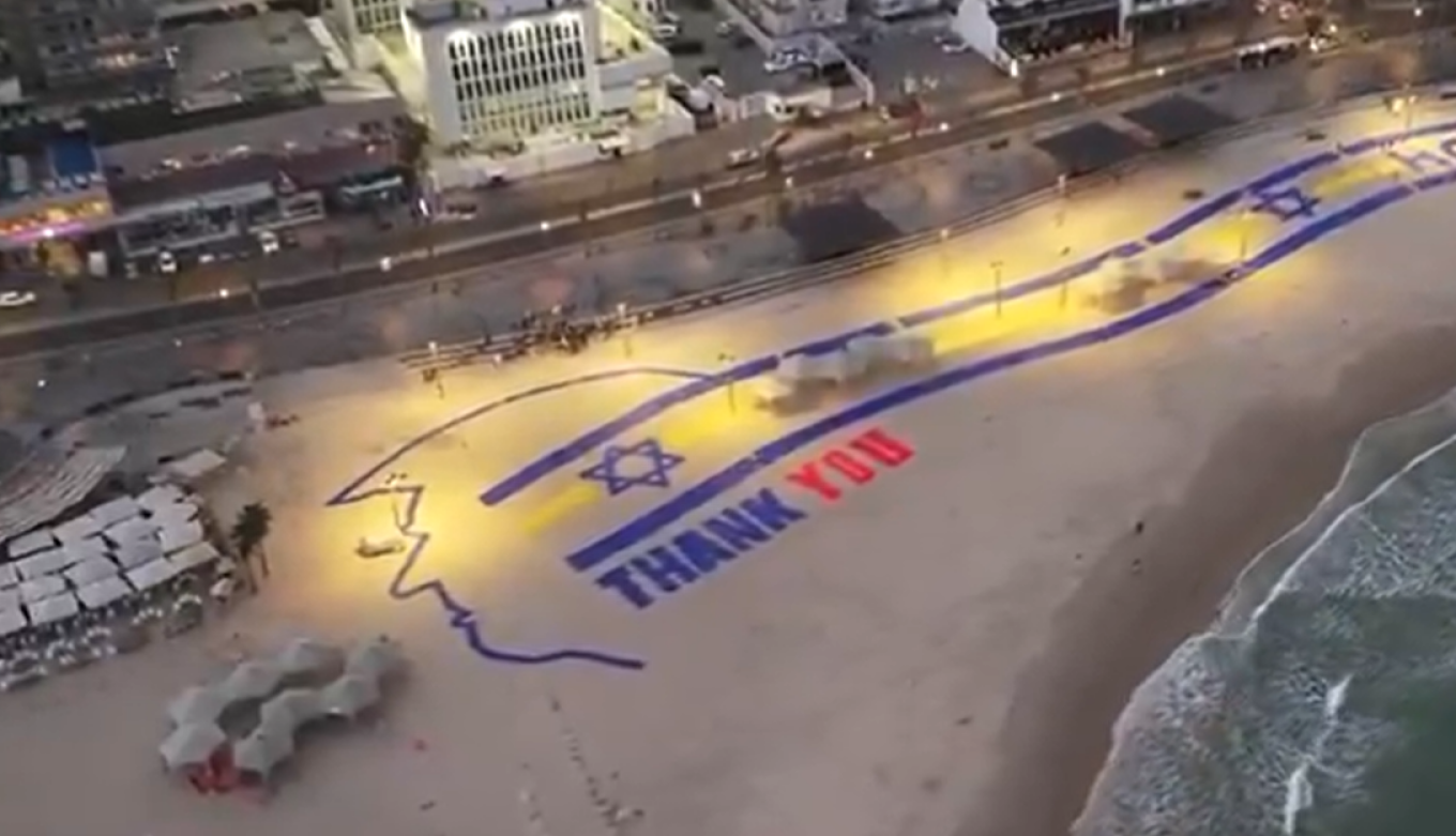 Άγνωστοι στο Τελ Αβίβ έγραψαν με τεράστια γράμματα στη άμμο της παραλίας τη φράση «thank you» και τη λέξη «home», συνοδεύοντάς την με το περίγραμμα του προσώπου του Ντόναλντ Τραμπ, ως ένδειξη ευγνωμοσύνης για τη συμφωνία που πέτυχε σχετικά με τη Γάζα και την επιστροφή των Ισραηλινών ομήρων.
