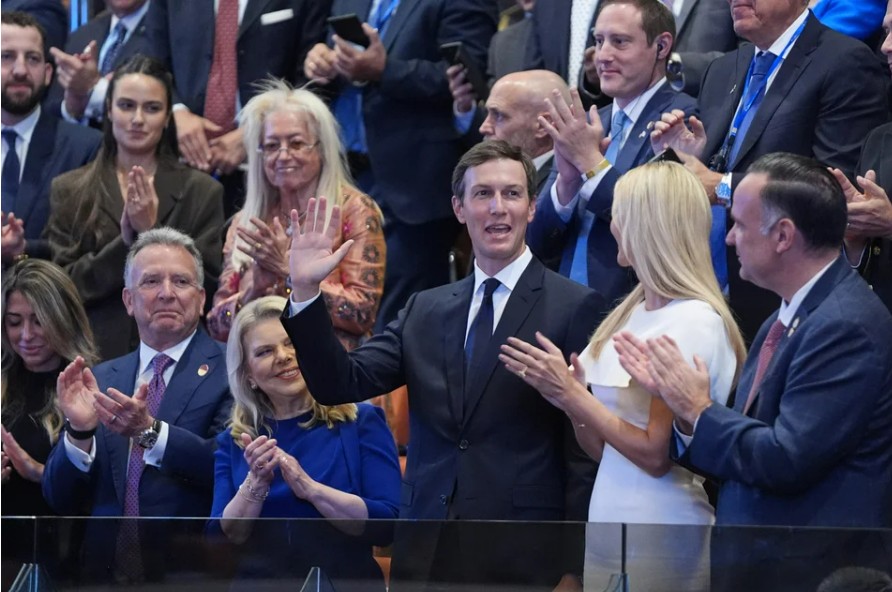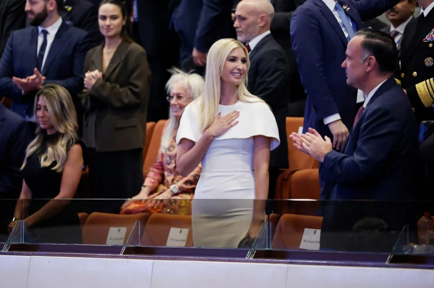 Πρόκειται για την Ισραηλινο-Αμερικανίδα δισεκατομμυριούχο Μίριαμ Άντελσον, η οποία καθόταν πίσω από την Ιβάνκα Τραμπ και συνοδευόταν από τον γιο της, Ματάν Άντελσον, και τον βουλευτή του κόμματος Λικούντ -ένα από τα πιο ιστορικά πολιτικά κόμματα του Ισραήλ- Μπόαζ Μπισμούτ, ο οποίος είχε προηγουμένως διατελέσει διευθυντής της εφημερίδας «Israel Hayom», που ανήκει στην οικογένεια Άντελσον.