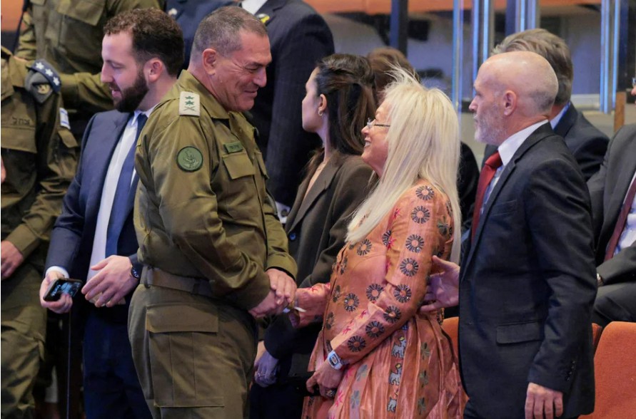 Μεταξύ των θεατών, όμως, στο θεωρείο των επισκεπτών της Ολομέλειας της Κνεσέτ ξεχώρισε μια ξανθιά γυναίκα με στρογγυλά γυαλιά και ένα μεταξωτό φόρεμα στο χρώμα του χαλκού, με τη χαρακτηριστική κίτρινη κορδέλα που συμβολίζει το κάλεσμα για την απελευθέρωση των ομήρων που απήχθησαν από τη Χαμάς.