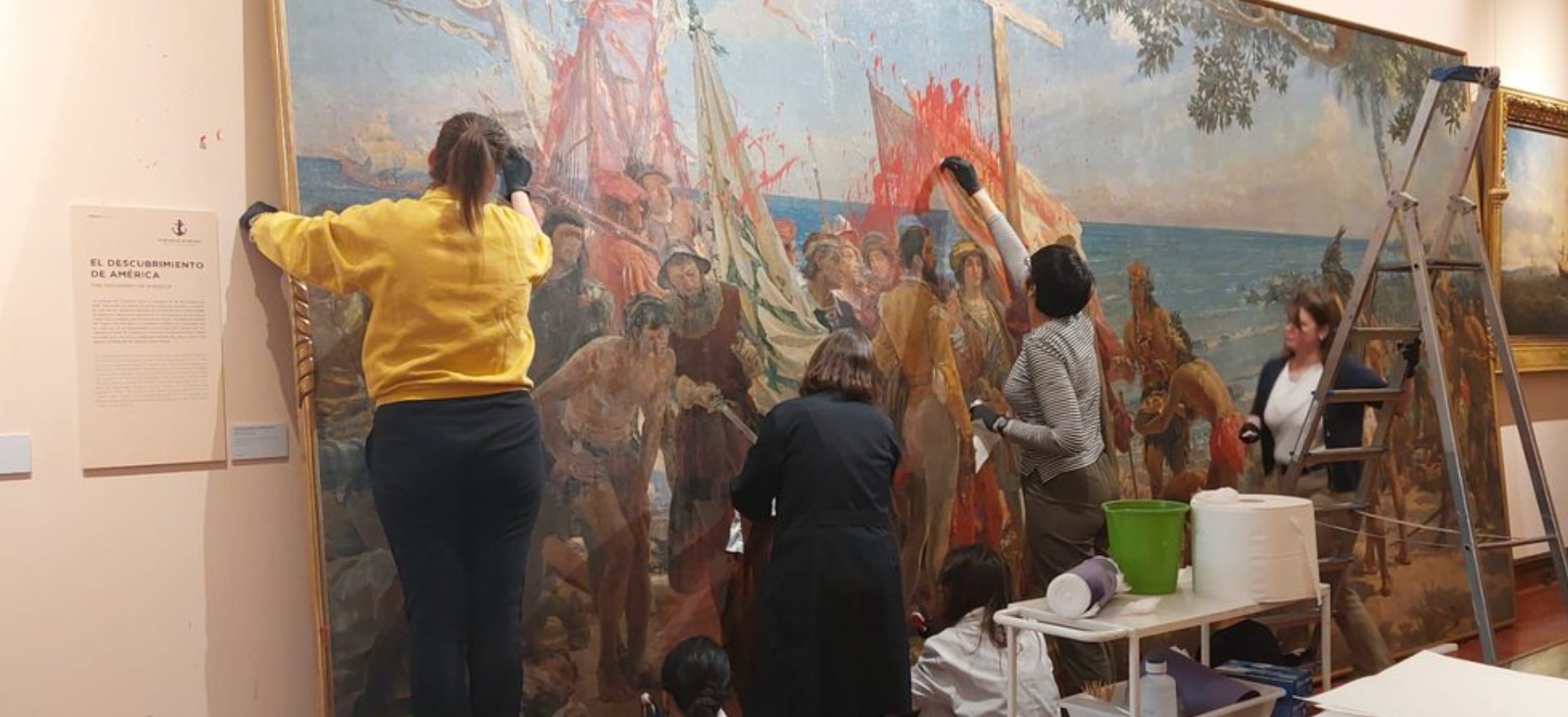 Σύμφωνα με τις αρχές, οι γυναίκες βανδάλισαν το έργο του Ισπανού ζωγράφου José Garnelo, με τίτλο «Primer homenaje a Cristóbal Colón» («Πρώτος φόρος τιμής στον Χριστόφορο Κολόμβο»), κατά τη διάρκεια διαμαρτυρίας ενάντια στον εορτασμό της επετείου. Οι δύο ακτιβίστριες συνελήφθησαν για έγκλημα κατά της πολιτιστικής κληρονομιάς, αφού πρώτα ακινητοποιήθηκαν από υπάλληλο του μουσείου μέχρι την άφιξη της αστυνομίας.