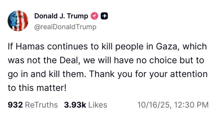Ο Αμερικανός πρόεδρος υπογραμμίζει επίσης σε ανάρτησή του στο Truth Social, ότι η εκστρατεία βίας στη Γάζα που έχει ξεκινήσει η οργάνωση από την έναρξη της εκεχειρίας «δεν ήταν μέρος της συμφωνίας».