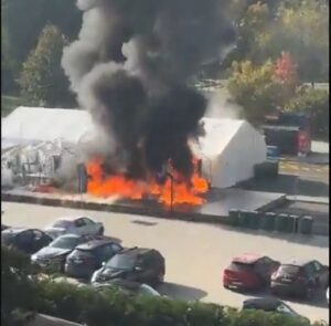 Παράλληλα, εκδηλώθηκε φωτιά σε τέντες που ήταν στημένες στον περιβάλλοντα χώρο.