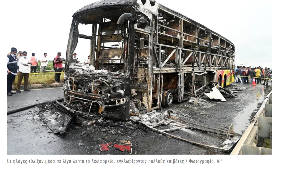 Η φωτιά έκανε μέσα σε λίγα λεπτά παρανάλωμα του πυρός το λεωφορείο εγκλωβίζοντας δεκάδες επιβάτες, πολλοί εκ των οποίων κοιμόντουσαν καθώς ταξίδευε σε αυτοκινητόδρομο κοντά στην πόλη Κούρνοολ στην πολιτεία Άντρα Πραντές της νότιας Ινδίας.