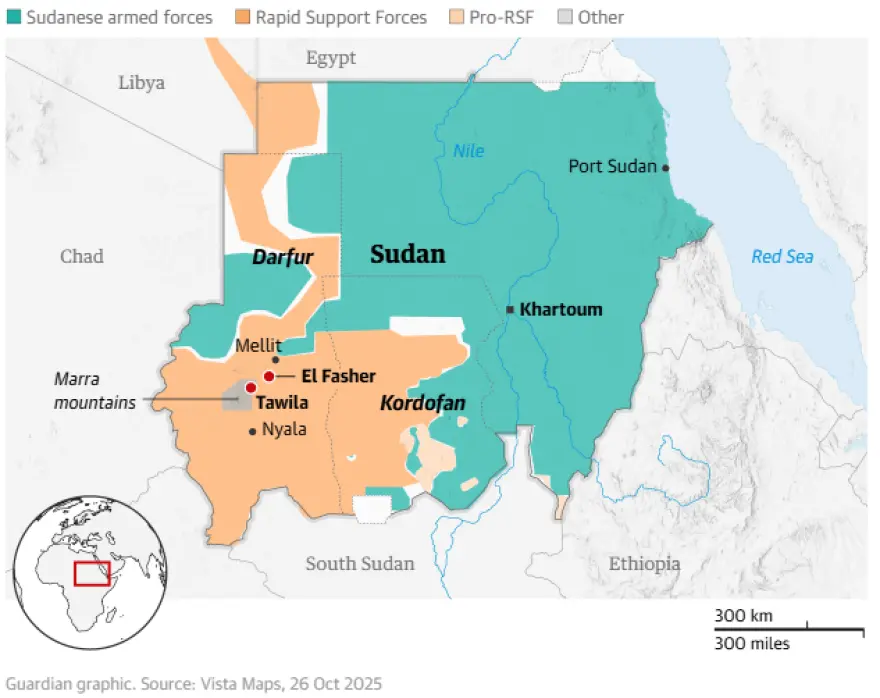 Η σύγκρουση, που ξεκίνησε με αφορμή τη διαφωνία για την ένταξη των RSF στις κρατικές ένοπλες δυνάμεις, έχει πλέον λάβει εθνοτικές και γεωπολιτικές διαστάσεις. Οι RSF ελέγχουν μεγάλο μέρος της δυτικής και νότιας επικράτειας, ενώ ο στρατός διατηρεί τον έλεγχο της Πορτ Σουδάν και των ανατολικών περιοχών. Διεθνείς παρατηρητές προειδοποιούν ότι η χώρα οδεύει προς διάλυση, με τον Νταρφούρ να μετατρέπεται ξανά σε επίκεντρο μαζικών εγκλημάτων κατά αμάχων.