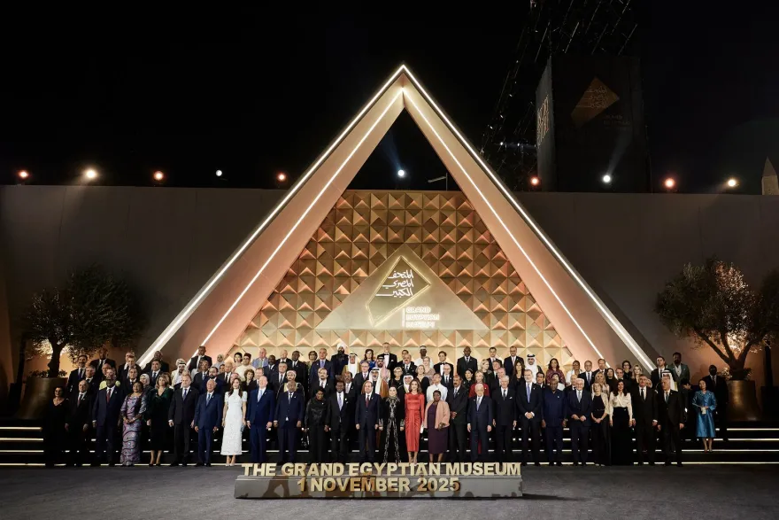 Οι ηγέτες φωτογραφήθηκαν μπροστά από τη χαρακτηριστική γυάλινη πρόσοψη του μουσείου, ενώ εντυπωσιακά πλάνα από αέρος ανέδειξαν τη μεγαλοπρέπεια του νέου πολιτιστικού συγκροτήματος που δεσπόζει με φόντο τις πυραμίδες της Γκίζας.