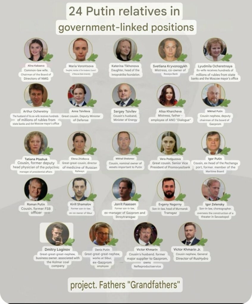 Μέλη της ευρύτερης οικογένειας του Πούτιν έχουν επίσης εξασφαλίσει προνομιακές θέσεις. Οι δύο ξάδελφοί του, Ίγκορ Πούτιν και Λιούμποβ Κρούγκλοβα, κατέχουν υψηλά αξιώματα σε οργανισμούς συνδεδεμένους με το κράτος, ενώ ο γιος της Κρούγκλοβα, Βίκτορ Χμάριν, είναι διευθύνων σύμβουλος της RusHydro, μιας από τις μεγαλύτερες εταιρείες ηλεκτρικής ενέργειας της Ρωσίας.