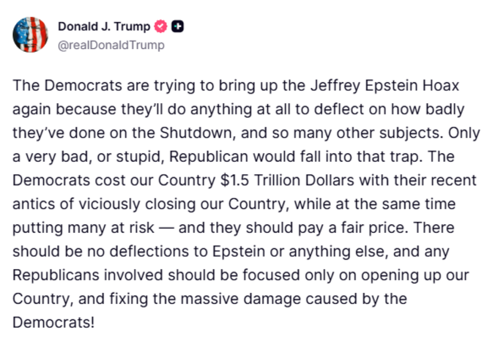 «Οι Δημοκρατικοί προσπαθούν να ξαναφέρουν στο προσκήνιο την απάτη με τον Τζέφρι Έπσταϊν, επειδή θα κάνουν τα πάντα για να αποσπάσουν την προσοχή από το πόσο άσχημα τα πήγαν με το κλείσιμο της κυβέρνησης και με τόσα άλλα θέματα. Μόνο ένας πολύ κακός ή ηλίθιος Ρεπουμπλικάνος θα έπεφτε σε αυτή την παγίδα.