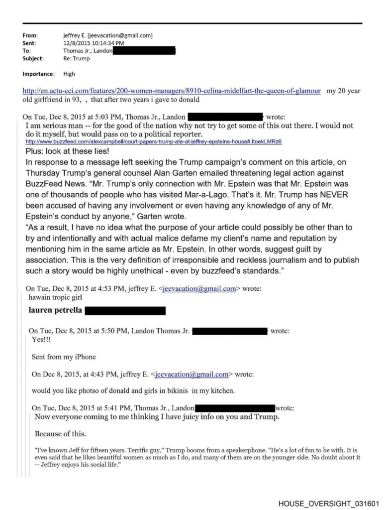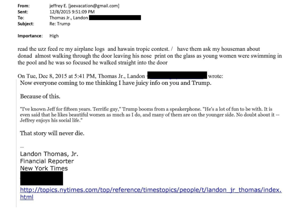 Σε άλλη ανταλλαγή, ο Έπσταϊν αναφέρεται σε μία 20χρονη φίλη που «έδωσε στον Ντόναλντ» το 1993 και μιλά σε δημοσιογράφο για φωτογραφίες του «Ντόναλντ και κοριτσιών με μπικίνι στην κουζίνα μου», χωρίς να είναι σαφές αν αστειεύεται ή αν προσπαθεί να «παίξει» με τον δημοσιογράφο για να αποκομίσει οφέλη.