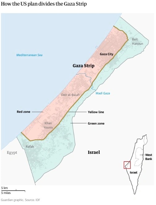 Ξένες δυνάμεις θα αναπτυχθούν αρχικά μαζί με Ισραηλινούς στρατιώτες στα ανατολικά της Γάζας, ενώ η κατεστραμμένη από τον πόλεμο περιοχή θα διαχωρίζεται από μια «κίτρινη γραμμή» η οποία θα ελέγχεται από το Ισραήλ, σύμφωνα με πηγές και έγγραφα στρατιωτικού σχεδιασμού των ΗΠΑ που περιήλθαν στην κατοχή του Guardian.