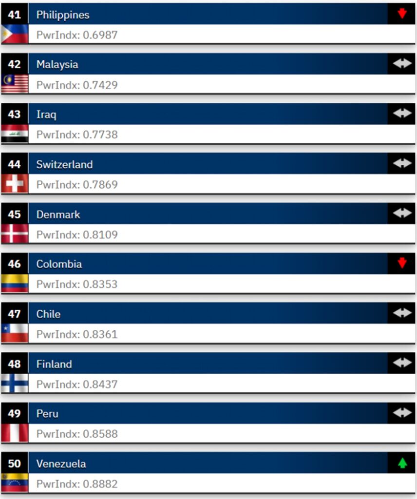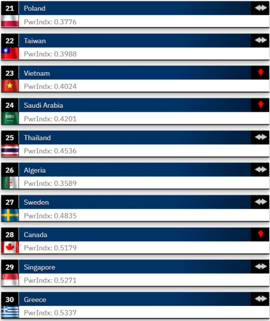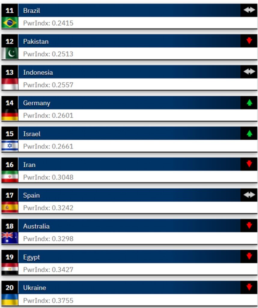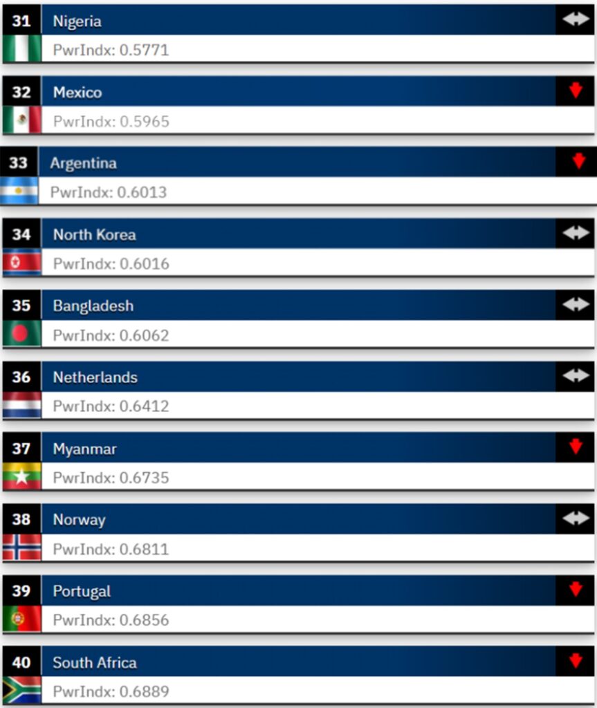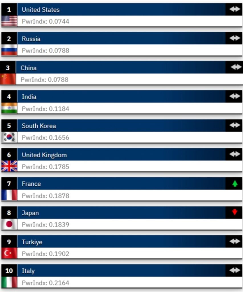 Το αποτέλεσμα αποτυπώνεται στον PowerIndex, έναν δείκτη που υπολογίζεται μέσω εσωτερικής φόρμουλας της εταιρείας. Παρότι η κατάταξη δεν θεωρείταιαπολύτως αξιόπιστη από στρατιωτικούς αναλυτές –λόγω της μυστικότητας που χαρακτηρίζει πολλούς εξοπλισμούς– παραμένει ενδεικτική για το πώς τοποθετούνται οι μεγάλες δυνάμεις.