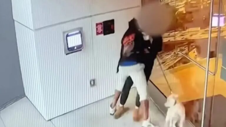 Στο βίντεο φαίνεται η γυναίκα να βρίσκεται στην είσοδο ενός πολυώροφου κτιρίου όταν ο άνδρας που φοράει μαύρο φούτερ με κουκούλα ορμά προς το μέρος της, την πιέζει πάνω σε μια γυάλινη πόρτα και τις επιτίθεται.