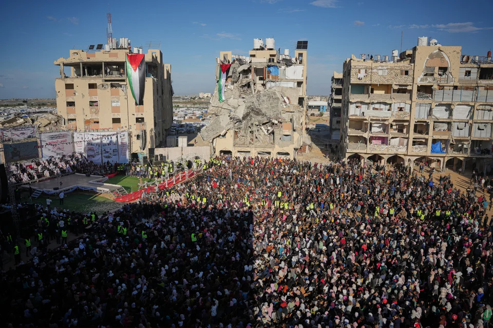 Δεκάδες χιλιάδες κόσμου συγκεντρώθηκε σε μια πλατεία στην Χαν Γιουνίς, περιτριγυρισμένοι από κατεστραμένα κτίρια και με τα σημάδια του πολέμου να είναι παντού εμφανή.