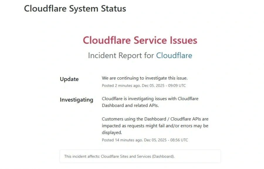 Η τελευταία ενημέρωση για το τεχνικό πρόβλημα που αντιμετωπίζει η Cloudflare δημοσιεύτηκε πριν από λίγο με την εταιρεία να αναφέρει ότι «συνεχίζει να διερευνά το ζήτημα».