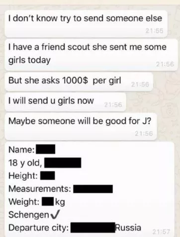«Δεν ξέρω, δοκίμασε να στείλεις κάποια άλλη. Έχω μια φίλη, μου έστειλε σήμερα μερικά κορίτσια. Αλλά ζητά 1.000 δολάρια το κορίτσι. Θα σου στείλω κορίτσια τώρα. Ίσως κάποια να είναι καλή για τον J;» αναφέρεται στο μήνυμα.