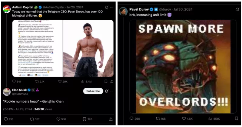 Η ανάρτηση του Ντούροφ πέρυσι ότι είχε συλλάβει περισσότερα από 100 παιδιά προκάλεσε μια αστεία απάντηση από τον Μασκ, ο οποίος ο ίδιος έχει τουλάχιστον 14 παιδιά για τα οποία γνωρίζουμε.